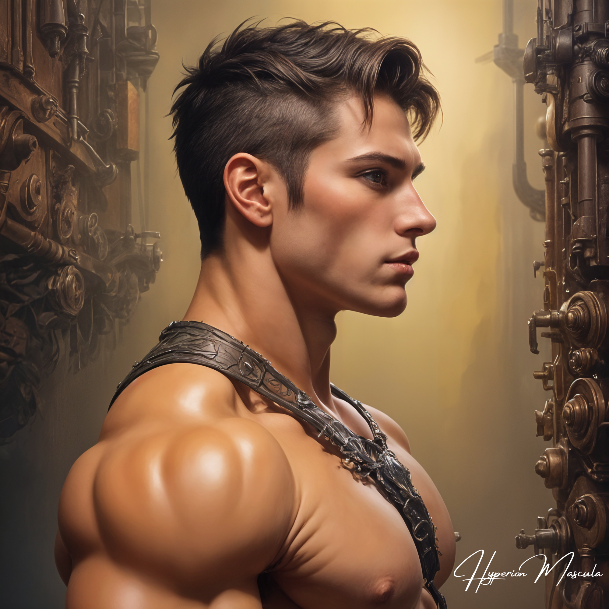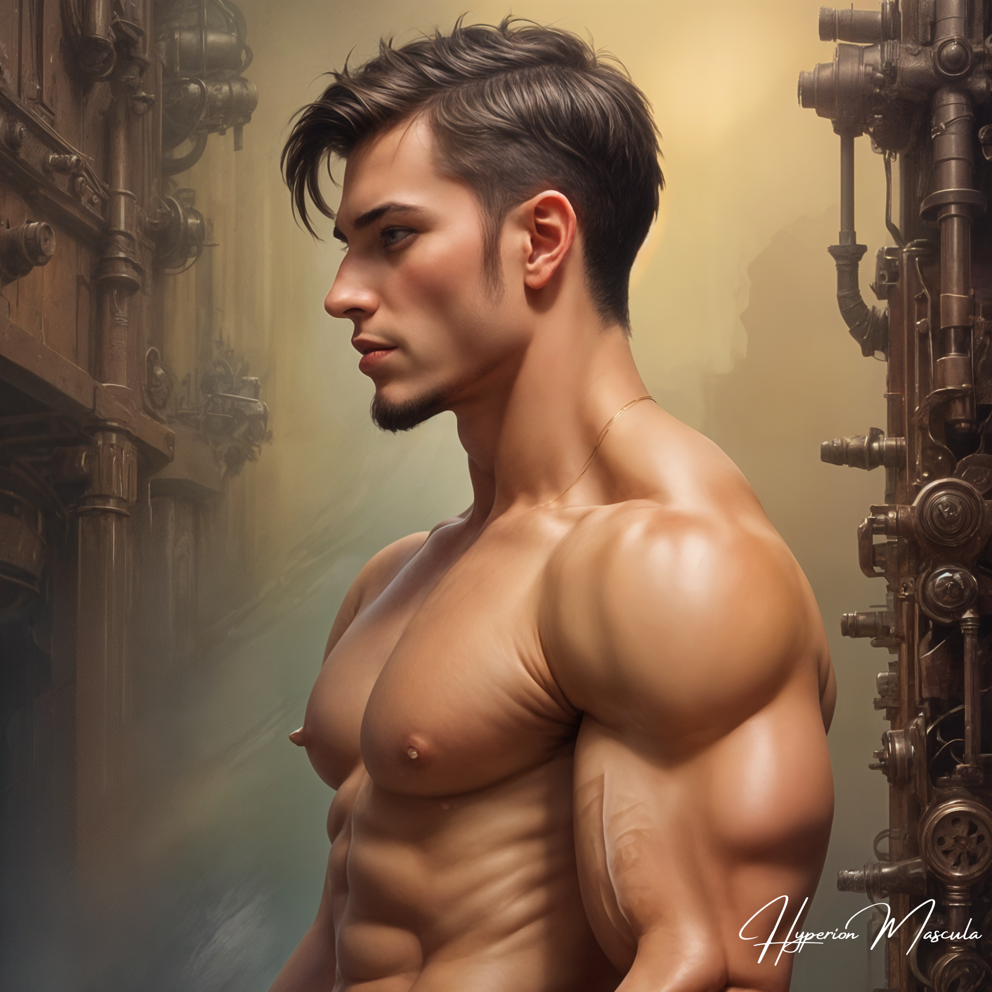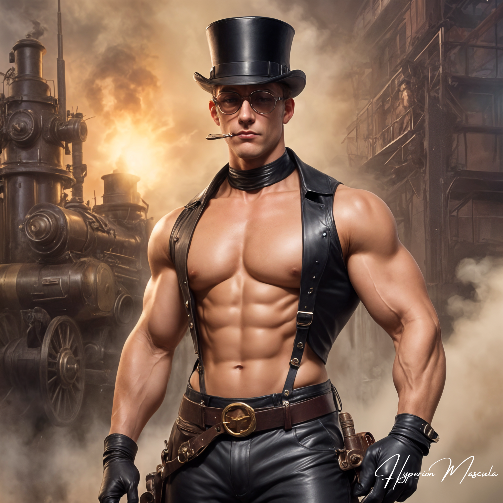 In a hidden workshop, nestled in the shadows of towering chimneys, a skilled engineer meticulously worked on a new invention. His muscular frame, accentuated by a leather harness with gleaming brass gears, moved with precision and purpose. His workshop was a treasure trove of mechanical wonders, each creation a testament to his ingenuity and passion for innovation.